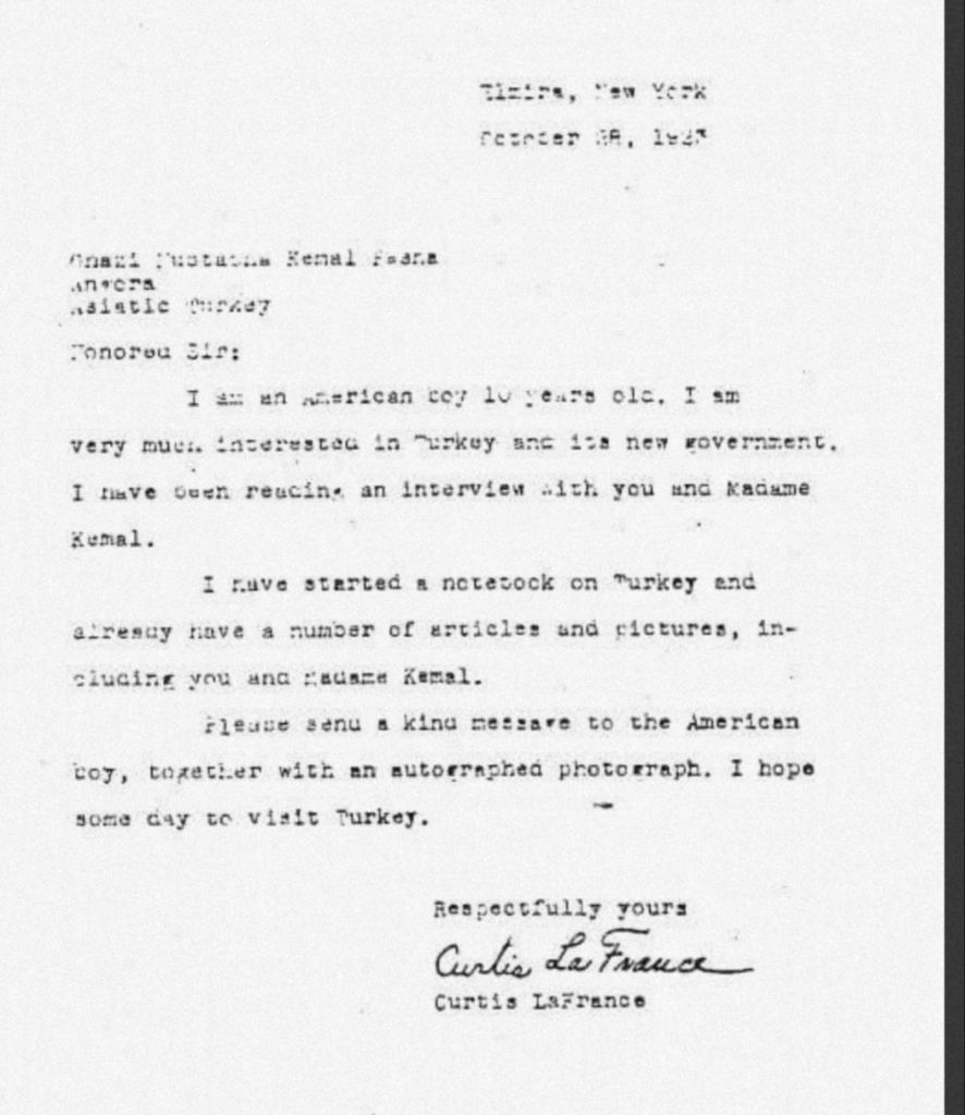 Peki, biliyor musunuz, bu bayramın içinde bir başka güzel hikaye saklı? Curtis lâ France… Küçücük bir çocukken, Atam sizin hayatınıza hayran kalmış. Daha 10 yaşında, Saturday Evening Post gazetesinde sizinle ilgili yazıyı okuduğunda, sanırım yüreği pır pır etmiş; o zaman anlamış ki, gerçek liderler, sadece kitaplarda değil, kalplerde yaşar! O da ne yapmış? Mektup yazmış size, formalite demeden, “Benim Atatürküm!” diyerek. Bir çocuğun kalbinden sizin kalbinize çok şey geçmiştir, değil mi? O mektubu yazarken belki de sizin Türkiye için verdiğiniz mücadeleyi hissetmiştir.